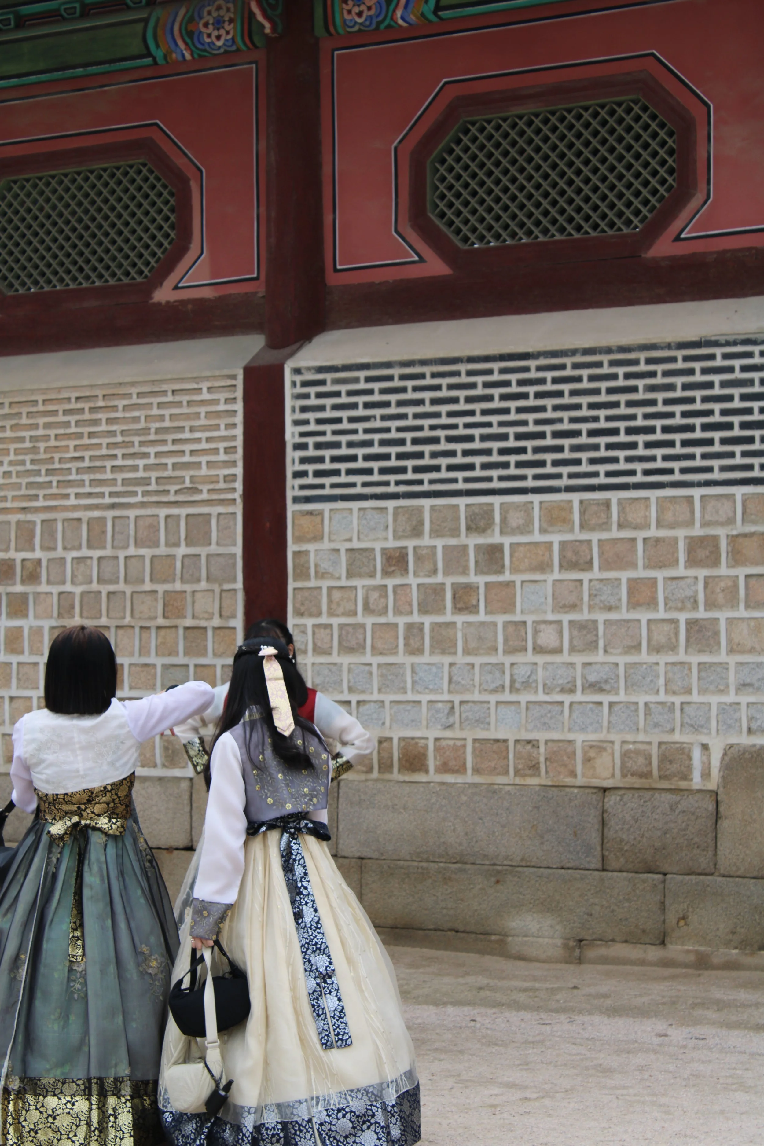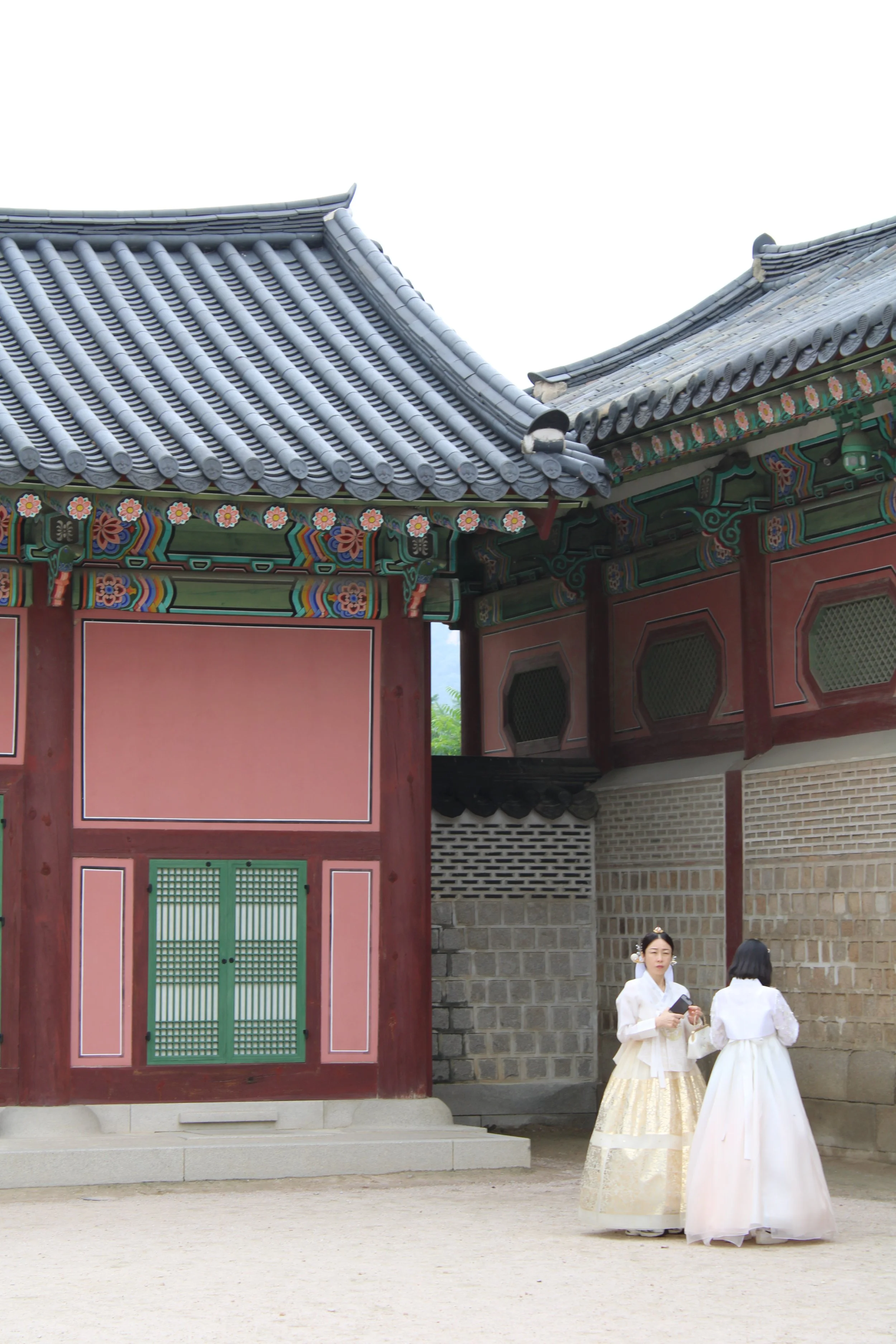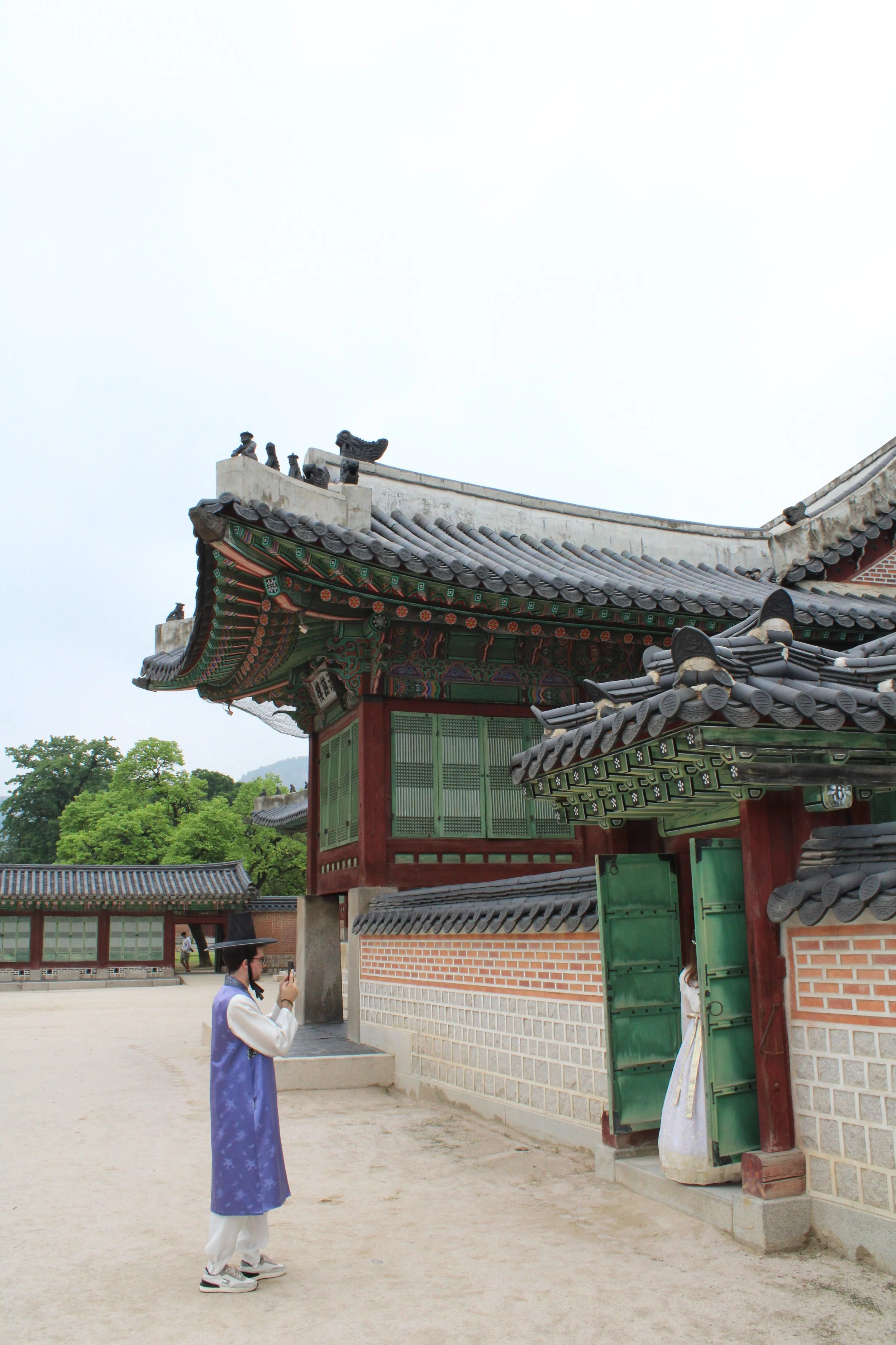 Visitors in vibrant hanbok stroll through the palace grounds, posing for photos with smartphones and tripods—blending past and present in every frame. The series explores how tradition and technology coexist in Seoul, offering a visual story of heritage reimagined in a contemporary world.